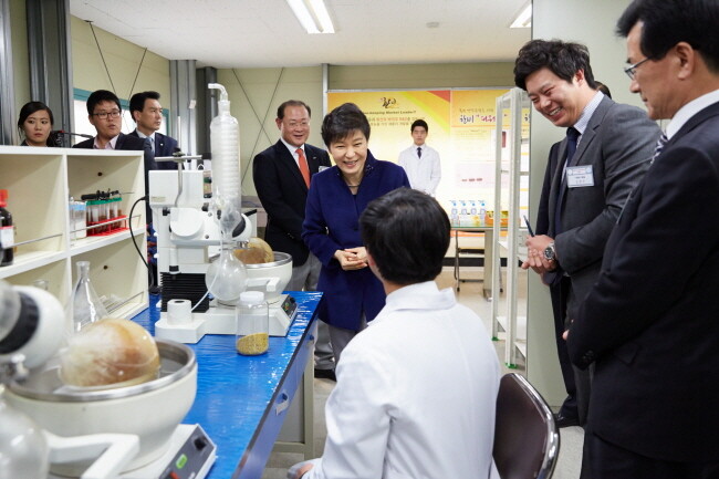 박 대통령은 이어 1998년 충북 소재 대학 중 최초로 지어진 창업보육센터를 찾았다. 충북보과대 창업보육센터에는 현재 22개 대학이 입주해 있고 바이오생명제약과 창업동아리 출신으로 창업한 ㈜한비는 3년만에 매출액 40억의 성과를 창출하고 있다. 박 대통령은 “충북지역이 바이오 분야에 특화되어 더욱 발전한다면 각지의 인재와 기업이 모여들어 지역 바이오 산업에 붐이 일어날 수 있다”고 말했다.