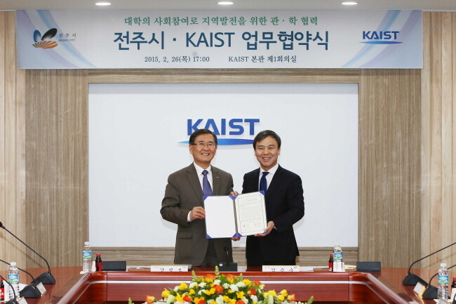 KAIST(총장 강성모)와 전주시(시장 김승수)가 26일 ‘융․복합 신산업 발굴 업무협약’을 체결했다.