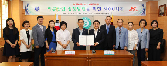 이날 협약식에는 경상대 권순기 총장, 본부보직자, 배종민 자연과학대학장, 이은진 의류학과장과 (주)콜핑 박만영 회장, 박도원 전무이사, 박상현 비서실장 등 10여 명이 참석했다.