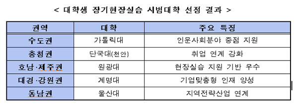 교육부(장관 황우여)와 한국연구재단(이사장 정민근)은 지난 25일 '장기현장실습 시범대학' 5개교를 발표했다.