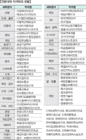 전문대학은 산업체 수요에 맞는 전문 직업인력 양성을 위해 전문성과 특색을 갖춘 이색학과를 다양하게 운영하고 있다. 모바일 기기 시대에 스마트폰 콘텐츠 전문가를 양성하는 ‘스마트폰미디어학부’를 비롯해 승강기 분야 전문 인력을 양성하는 ‘승강기공학부’, 패션분야 전문 매니저를 양성하는 ‘패션브랜드매니저과’, 서비스업을 비롯한 각종 창업전문가를 양성하는 ‘프랜차이즈창업경영과’ 등이 대표적이다.