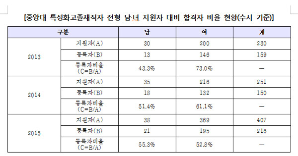 정 의원에 따르면 중앙대는 당시 소명자료에서 "(지식경영학부는) 입시 경쟁률이 낮고 합격 후에도 등록 포기자가 계속 발생, 학교 측 입장에서는 지원자의 남·녀 성비를 감안하면서 선발할 수 있는 여력 자체가 없는 상황"이라고 해명했다.