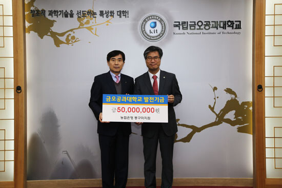 금오공과대학교(총장 김영식)가 18일 금오공대 본관 접견실에서 NH농협은행 동구미지점으로부터 발전기금 5000만 원을 기탁 받았다.