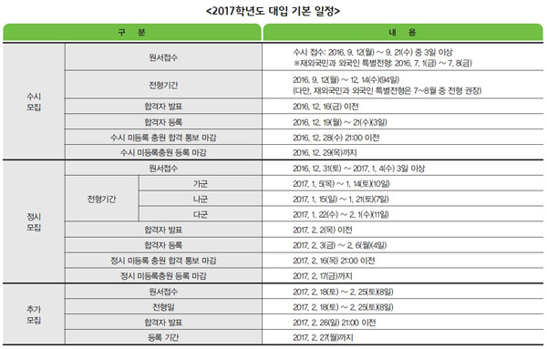 또한 2017학년도 수능에서는 국어 수준별 시험(A·B형)이 폐지되고 수학은 문·이과로 구분, ‘나·가’형으로 실시됩니다.