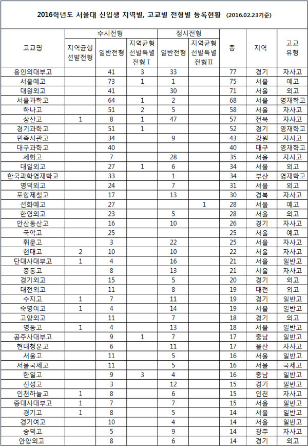 국회 교육문화체육관광위원회 윤재옥(새누리당) 의원이 26일 서울대로부터 제출받은 '2016 서울대 신입생 고교별 등록현황(최종합격, 2월 23일 기준)'을 분석한 결과 올해 서울대 신입생을 1명 이상 배출한 고등학교는 전국에서 총 824개교였다.