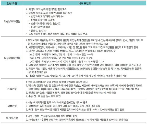 그러나 실제 학생들이 수시 전형에 지원하기 위해서는 아래의 전형 유형을 기준으로 지원 여부를 판단할 수 있습니다. 또한 각 전형별 체크 포인트를 확인, 어떤 전형에 해당되는지를 파악하고 앞으로 남은 수험 기간 동안 준비해야 할 사항을 살펴보시길 바랍니다.