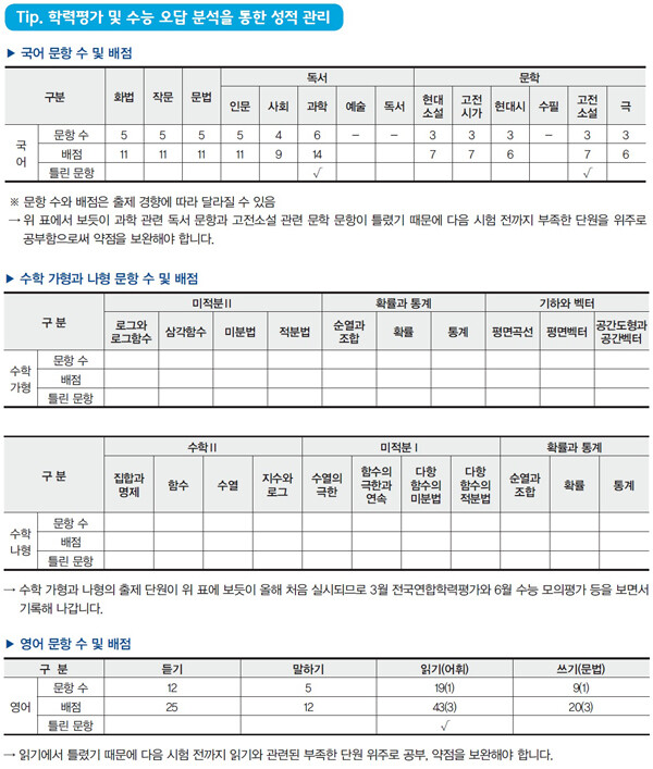 9월 수능 모의평가는 수시 지원 전 마지막 시험으로 9월 가채점 결과와 6월 모의평가 점수를 토대로 정시에 지원 가능한 대학 수준을 정확히 파악, 수시 지원전략을 세워야 합니다. 수시와 정시를 어떻게 지원하는 것이 적합한지 학생의 수시·정시 적합유형을 따져보고 수능 최저학력기준 만족을 위한 향후 학습계획도 함께 수립하는 것이 좋습니다.