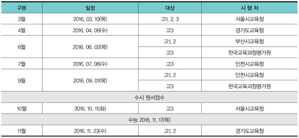 A. 3월 10일에 실시된 3월 전국 연합학력평가를 시작으로 10월 11일까지 4번의 교육청 주관 전국 연합학력평가와 6월, 9월 2번의 평가원 주관 수능 모의평가가 실시됩니다. 고3 학생들은 6번의 시험을 통해 자신의 위치를 파악하고 부족한 영역과 단원을 보완하기 위한 공부를 해야 합니다.