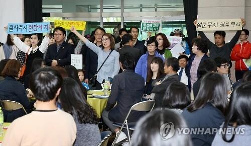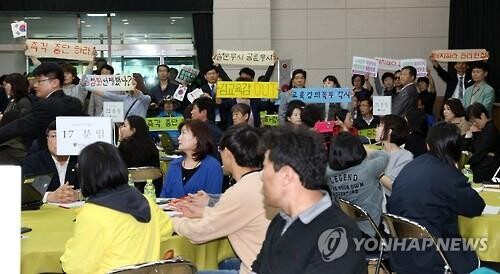 시위가 격렬해져 크고 작은 소동이 일어나면서 토론이 정상적으로 이뤄지기 어렵겠다고 판단한 도교육청은 회의가 시작한 지 2시간 만인 이날 오후 3시께 토의를 멈추고 행사를 중단했다.