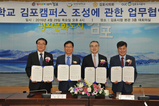 국민대는 29일 김포시와 김포시의회, 김포도시공사와 김포시청 대회의실에서 김포시 사우동 일원 풍무역세권 개발 사업지구 내에 '국민대학교 김포캠퍼스 조성에 관한 양해각서(MOU)'를 체결했다.