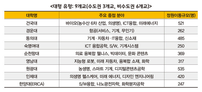 구체적으로 대형에는 건국대, 경운대, 동의대, 숙명여대, 순천향대, 영남대, 원광대, 인제대, 한양대(ERICA) 등 9개 대학이 선정됐다.