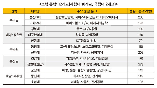또한 소형에는 ▲수도권: 성신여대, 이화여대 ▲대경·강원권: 경북대, 대구한의대, 한동대 ▲동남권: 동명대, 신라대 ▲충청권: 건양대, 상명대(천안) ▲호남·제주권: 군산대, 동신대, 호남대 등 12개 대학이 선정됐다.