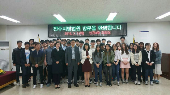이날 허강무 전북대 공공인재학부 학부장을 비롯해 1학년 학생 40여 명은 전주지방법원을 찾아 청사를 둘러보고 홍보영상물을 시청하는 한편 실제 재판을 방청했다.