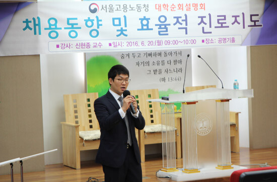 삼육보건대학교(총장 박두한)는 지난 20일 삼육보건대 공명기홀에서 페어링HR 대표이며 중부대학교에서 강의를 하고 있는 신현종 교수를 초청해 2016 채용동향과 효율적인 진로지도에 대한 특강을 진행했다.
