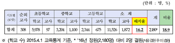 실제 신 의원이 교육부로부터 제출받은 '2016년 전문상담교사 배치 현황'을 보면 초·중·고 전문상담교사 평균 배치율은 16.2%였다. 6개 학교당 전문상담교사가 1명꼴인 셈. 초등학교의 경우 전국 초등학교 수 5978개에 비해 전문상담교사는 97명으로 배치율이 1.6%에 불과했다.