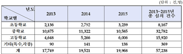 국회 교육문화체육관광위원회 소속 신동근 의원이 교육부로부터 제출받은 '학교폭력발생 현황 자료'를 분석한 결과 지난 3년(2013년~2015년) 동안 초·중·고 폭력사건으로 인한 학교폭력대책자치위원회 심의 현황이 1만 7749건에서 1만 9968건으로 11.1%p(2219건) 증가했다.