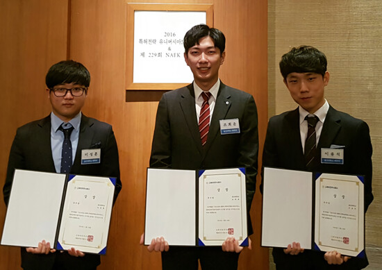 [대학저널 신효송 기자] 울산대학교(총장 오연천) 화학과 특허동아리 이성훈, 이용석, 조희윤 씨가 2016년 캠퍼스 특허전략 유니버시아드에서 특허전략수립 부문 우수상을 수상했다. 시상식은 지난 24일 서울 신라호텔에서 열렸다.