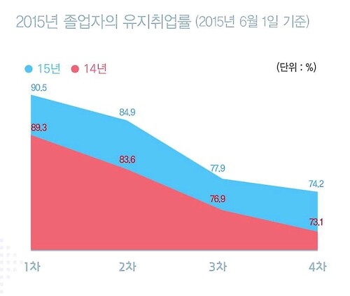 '고용의 질'을 가늠할 수 있는 유지취업률(일정 기간 이상 취업을 유지하는 비율)은 12개월 기준 74.2%로 2014년보다 1.1% 포인트 증가했다. 이는 취업자 중 26% 정도는 1년을 채우지 못하고 직장을 그만뒀다는 의미다.