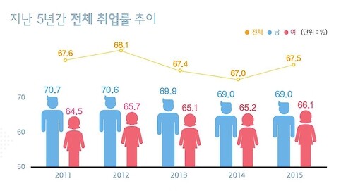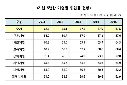 전체 취업률은 2011년 67.6%에서 2012년 68.1%로 상승했다. 이어 2013년 67.4%, 2014년 67.0%로 2년 연속 감소하다 지난해 소폭 상승했다.