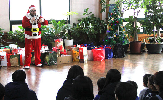 이날 산타 복장을 한 원어민교사들은 아이들이 희망하는 선물을 사전에 조사해 준비한 선물을 건네고 음식을 나누며 즐거운 시간을 보냈다. 또한 보육과 시설관리 등으로 애쓰는 육아원 관계자들을 격려하기 위한 선물도 전달했다.