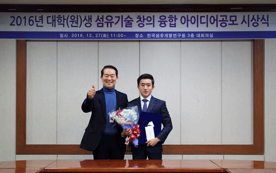 지난 2016년 9월 아이디어 공모를 시작해 1차 서류심사와 2차 발표심사를 거친 결과 '교대배열 PVA 중공사 멤브레인 제조' 기술을 제안한 김원섭 씨가 영예의 대상을 수상했다. 이 기술은 지역의 신 산업인 물 산업에 적용되는 첨단소재 제조기술의 하나로 창의성과 실용성을 고루 갖췄다는 점에서 높은 평가를 받았다. 김 씨는 부상으로 상금 500만 원을 받았다. 한국섬유개발연구원 채용 시 서류전형 면제 혜택을 받는다.