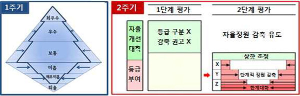 실제 교육부의 '2017년 업무계획'에 따르면 2주기 대학구조개혁평가 모델은 자율개선대학과 X, Y, Z등급 대학으로 구분된다. 이는 교육부 정책연구진이 지난해 11월 발표한 내용과 동일하다. 당시 교육부 정책연구진은 자율개선대학들(기존 B등급 이상)의 경우 자율 정원감축을 유도하고 X, Y, Z등급 대학들의 경우 각각 10%, 15%, 30% 정원을 감축하는 방안을 제안했다.