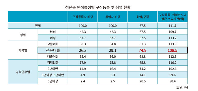 20대 청년층의 인적특성별 취업현황을 살펴보면 구직자 대비 취업성과는 전문대졸 이상 학력과 5년 미만 경력직에서 높은 것으로 분석됐다. 특히 구직등록에서 취업까지의 평균 소요기간이 전문대학 졸업 이상은 108.5일로 일반대학 졸업 이상(112.3일)과 고교 졸업 이하(113.9)보다 짧았다.