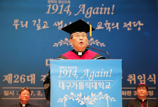 이날 취임식에는 조환길 학교법인 선목학원 이사장(천주교 대구대교구장), 우동기 대구시교육감, 최영조 경산시장, 김계남 총동창회장, 대구대교구 사제 수도자, 교직원과 학생 등 400여 명이 참석해 축하했다.