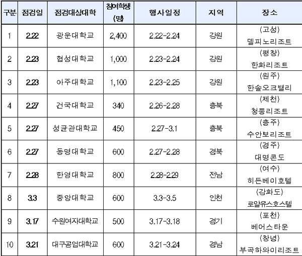 이번 안전점검 대상은 광운대, 협성대, 아주대, 건국대, 성균관대, 동명대, 한영대, 중앙대, 수원여대, 대구공업대(이상 안전점검 실시순) 등 10개 대학이다. 교육부는 학생 수와 개최 지역을 고려, 대상 대학을 선정했다.