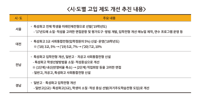 구체적으로 서울시교육청은 2019학년도부터 특성화고 전체를 대상으로 미래인재전형을 도입한다. 이를 위해 서울시교육청은 2017년에 소질·적성을 고려한 면접문항·평가도구 개발, 입학전형 개선 매뉴얼 제작, 연수 프로그램 운영 등을 추진한다. 경남교육청 역시 일반고·특성화고 입학전형을 소질·적성 중심 선발(자기주도학습전형 도입)로 개선한다.