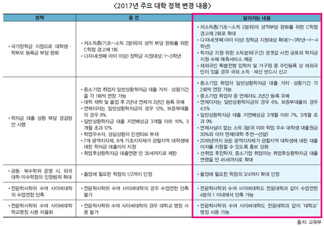특히 2017년 1학기부터 저소득층 학생의 성적 부담 완화를 목적으로 'C학점 경고제' 적용 횟수가 1회에서 2회로 확대된다. 교육부는 "2014년 2학기에 도입된 'C학점 경고제'는 기초생활수급자 등 저소득층(기초~소득 2분위) 학생이 생활비 마련으로 학업에 집중하지 못해 성적 기준을 충족하지 못한 경우 1회에 한해 장학금을 지원하는 것"이라면서 "이번 제도 개선으로 2만여 명의 학생이 추가로 지원받을 수 있다"고 설명했다.