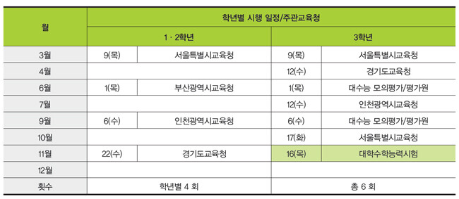 3월 9일 실시되는 서울시교육청 연합학력평가를 시작으로 10월 17일까지 4번의 교육청 주관 연합학력평가와 6월, 9월 2번의 평가원 주관 수능 모의평가가 실시됩니다. 고3 학생들은 6번의 시험을 통해 자신의 위치를 파악하고 부족한 영역과 단원을 보완하기 위한 공부 계획을 수립해야 합니다.