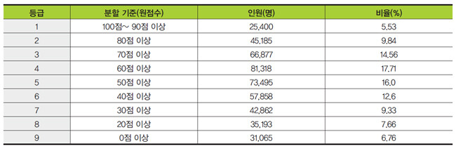 응시자수에 따른 전국 단위의 등급별 인원수를 확인할 수 있습니다. 자신의 등급에 해당되는 학생은 몇 명이며, 해당 등급 누적인원을 살펴보면 자신보과 성적이 비슷하거나 우수한 학생을 확인할 수 있습니다. 정해진 기준에 의하면 1등급은 4%, 2등급은 7%이지만 동점자가 발생하는 경우 그 비율은 달라질 수 있습니다.