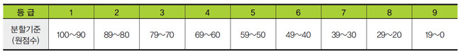 영어 영역 성적은 한국사 영역과 마찬가지로 절대평가에 따른 등급만 제공하며, 등급 수 역시 9개 등급으로 결정됐습니다. 영어 영역 만점은 현재와 동일하게 100점이며, 등급 간 점수 차이는 10점으로 설정됐습니다. 9개 등급을 분할하는 원점수는 아래와 같습니다.
