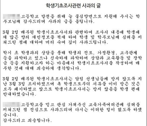 그러자 일부 학부모가 '과도한 정보 수집'이라며 지역교육청 등에 항의했고, A고교는 이튿날 가정통신문과 일부 학생이 제출한 조사서를 모두 폐기했다.