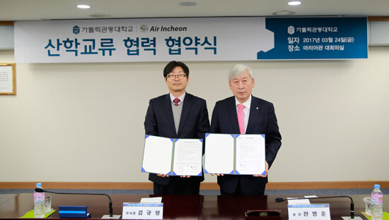 [대학저널 이원지 기자]가톨릭관동대학교(총장 천명훈)와 에어인천(주)(부사장 김규형)는 24일, 마리아관 대회의실에서 천명훈 총장과 김규형 부사장 등 양 기관 관계자들이 참석한 가운데 산학교류 협약을 체결했다.