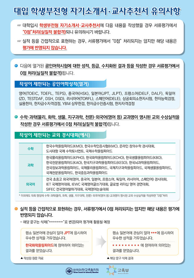 마지막으로 자소서를 작성하면서 반드시 유의해야 할 사항이 있습니다. '0점' 처리 규정이 적용된다는 것입니다. 공인어학성적과 수학, 과학(물리·화학·생물·지구과학·천문), 외국어(영어 등) 교과명이 명시된 외부 수상 실적은 자소서에 기재 시 '0점' 처리됩니다.