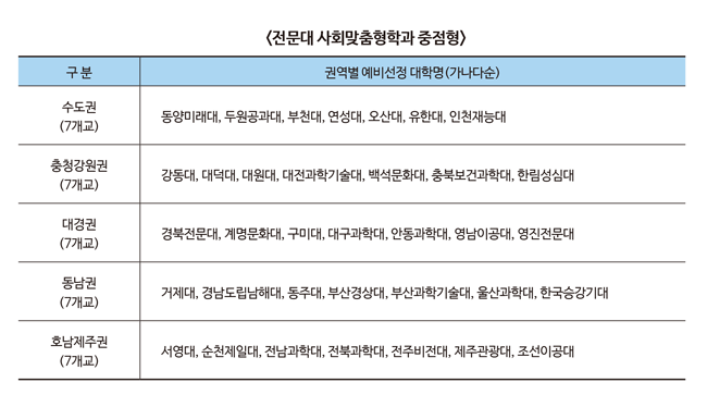 전문대학의 경우 동양미래대를 비롯해 두원공과대, 부천대, 연성대, 오산대, 유한대, 인천재능대(이상 수도권) ▲강동대, 대덕대, 대원대, 대전과학기술대, 백석문화대, 충북보건과학대, 한림성심대(충청/강원권) ▲경북전문대, 계명문화대, 구미대, 대구과학대, 안동과학대, 영남이공대, 영진전문대(이상 대경권) ▲거제대, 경남도립남해대, 동주대, 부산경상대, 부산과학기술대, 울산과학대, 한국승강기대(이상 동남권) ▲서영대, 순천제일대, 전남과학대, 전북과학대, 전주비전대, 제주관광대, 조선이공대(이상 호남/제주권) 등 35개 대학이 '사회맞춤형학과 중점형' 권역별 예비선정 명단에 이름을 올렸다.