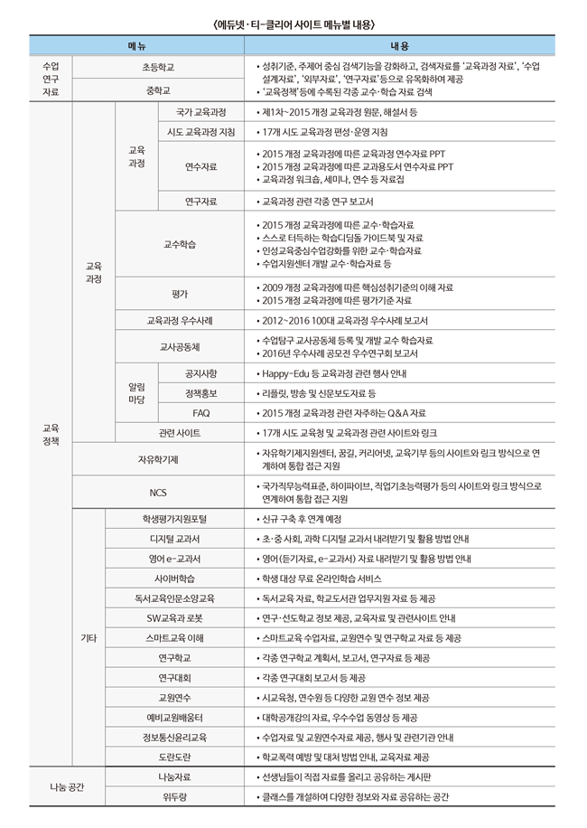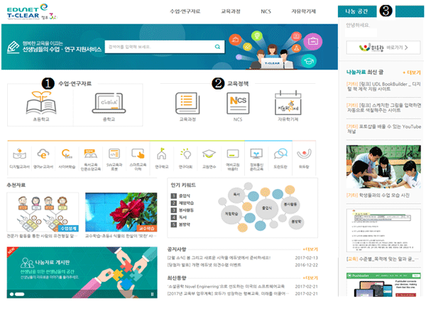 먼저 '수업·연구 자료' 영역에서는 교과별 교육과정 성취 기준이나 주제어를 검색하면 ▲수업설계 자료 ▲교수·학습 자료 ▲외부자료 ▲연구자료 등 교육자료들을 항목별로 볼 수 있다. '교육정책' 영역에서는 ▲교육과정 ▲자유학기제 ▲국가직무능력표준(NCS) 등의 메뉴를 통해 다양한 정책 자료 검색이 가능하다. 또한 '나눔 공간' 영역은 교사들을 위한 커뮤니티 서비스 공간으로 활용된다. 특히 교육부는 '에듀넷·티-클리어(T-CLEAR)'의 활성화 차원에서 우수 콘텐츠를 올리거나 활용을 잘하는 교사와 커뮤니티 그룹에게 인센티브를 제공할 방침이다.