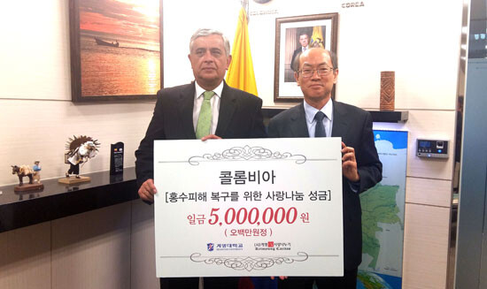 계명대 김용일 학생부총장 일행은 17일 콜롬비아 대사관을 방문하고 띠또 사울 삐니야(Tito Saul Pinilla)주한 콜롬비아 대사를 만난 자리에서 수해복구 성금을 직접 전달했다.