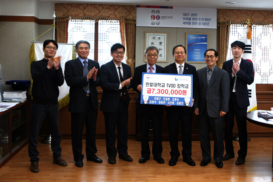 한밭대 최종인, 이재구, 모중환, 김정석, 김명숙, 서진원 교수를 비롯해 장동관 (주)동인비즈넷 대표가 대학발전기금을 전달한 것. 이들은 학생들의 창업위기를 극복하는데 지원하는 'TVOD 장학금'으로 써 달라며 730만 원의 대학발전기금을 한밭대에 전달했다.