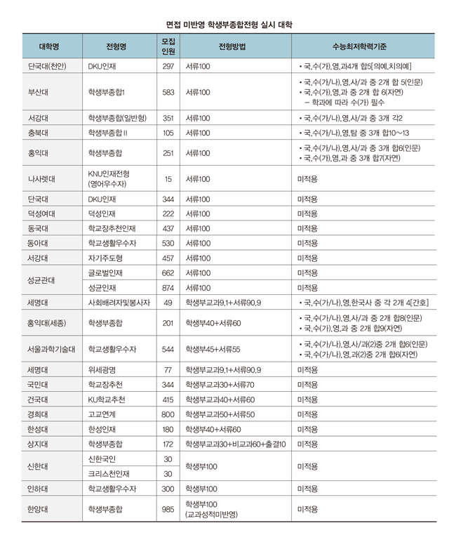학생부종합전형은 대부분의 대학이 수능최저기준을 적용하지 않고, 1단계 서류평가와 2단계 면접평가의 단계에 따른 선발을 합니다. 그러나, 대학에 따라 일괄선발 방식, 또는 면접을 실시하지 않고 서류평가로만 선발을 하기도 합니다. 학생부종합전형임에도 수능최저학력기준을 요구하는 대학도 있습니다. 따라서 자신의 장점을 고려하여 이에 맞는 대학의 전형 방식을 선택, 지원하여야 합니다.