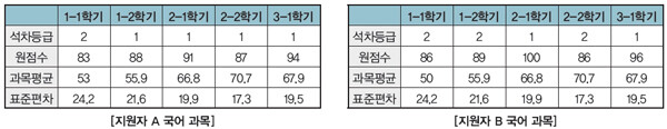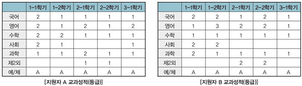두 지원자의 국어 과목의 1-2학기 등급은 1등급 차이가 나지만 국어 과목의 원점수, 표준편차, 과목 평균 등을 비교하여 살펴보면 지원자 B의 학업성취도가 A에 비해 떨어진다고 보기는 어렵습니다. 학생부의 교과학습발달상황의 학업성취도뿐 아니라 세부능력 및 특기사항, 수상실적 등도 서류평가의 근거가 되므로 학생부종합전형에서 교과 성적은 절대적이 아님을 유념하여야 합니다.
