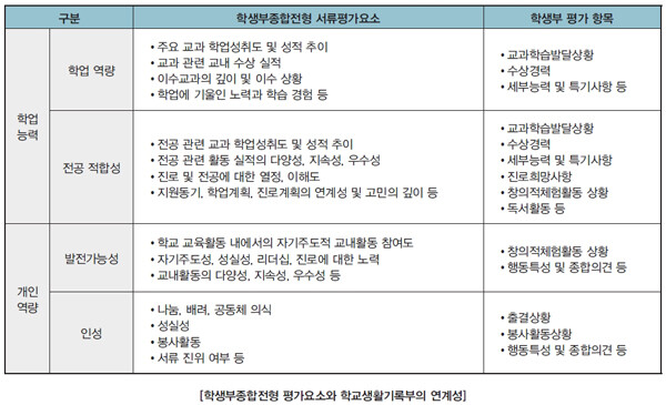 학생부종합전형은 지원자의 서류를 바탕으로 학업능력, 전공적합성, 발전가능성 등에 대한 종합평가로 최근 대학들은 학교생활 충실도가 높은 학생을 선발하려는 경향이 두드러집니다. 고등학교 생활에 충실하고 발전가능성을 보이는 학생이 대학 생활도 충실히 할 것이라는 기대 때문입니다. 따라서 학생부의 비교과 활동은 교과 성적과 더불어 학업능력과 개인의 역량을 파악하는 데 활용합니다. 학생부 기재는 학교 선생님께서 작성하는 사항이지만 다음의 사항을 참조하여 학생부 내용을 살펴보고 자기소개서를 준비하는 데 활용할 수 있습니다.