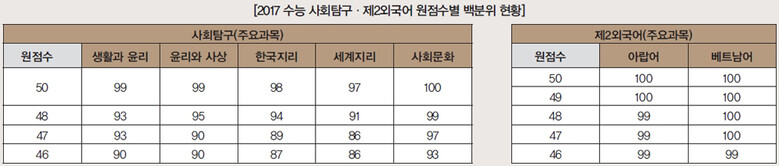 2017 수능은 다른 해와 달리 비교적 사회탐구 과목 간 유·불리 논쟁이 적었던 편이다. 원점수 만점에 따른 백분위가 100(2과목), 99(5과목), 98(1과목), 97(1과목) 등으로 비교적 고르게 분포됐기 때문이다. 그러나 표에서 보는 것처럼 원점수 48점과 47점을 비교하면 유·불리가 극명하게 드러나는 것을 알 수 있다.