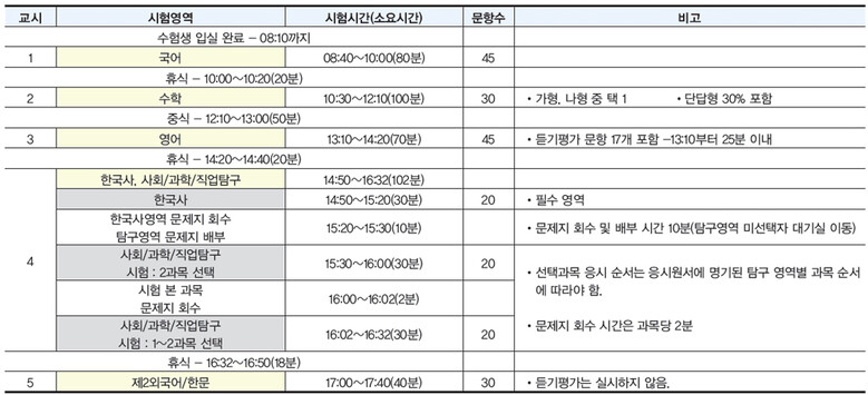 2018 수능 시험시간과 영역별 문항 수는 표를 참조하시면 됩니다.