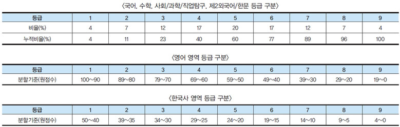 수능 성적표는 국어, 수학, 영어, 한국사, 사회/과학/직업탐구, 제2외국어/한문 등으로 영역이 구분됩니다. 수학 영역은 시험 유형('가'/'나'형)을, 사회/과학/직업탐구와 제2외국어/한문 영역은 응시 선택과목명이 표기됩니다. 영역·과목별로 표준점수, 백분위, 등급이 기재되지만 영어와 한국사 영역의 경우 절대평가에 따라 등급만 기재됩니다.