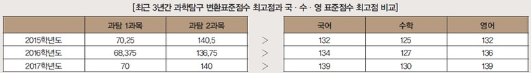자연계열 입시 환경을 이야기할 때 과학탐구가 빠지지 않는 편이다. 표에서 보는 것과 같이 과학탐구 표준점수가 국어·수학·영어 표준점수보다 높기 때문이다. 자연계열 특성상 정시 전형에서 과학탐구 반영 비율이 수학만큼 높다는 점을 감안하면, '과학탐구 표준점수 크기가 크다는 것은 입시적으로 과학탐구가 아주 중요하다'는 것을 의미한다. 영어 영역에서 절대평가가 실시되고, 수학 '가'형 표준점수 크기가 더 커지기 어려운 상황에서 2018학년도 역시 과학탐구 표준점수 최고점이 영역별 최고점이 될 가능성이 높다. 자연계열 학생들은 좀 더 치밀하게 과학탐구를 준비할 필요가 있다.