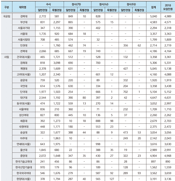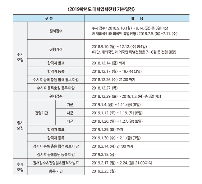2019학년도 전체 모집인원 가운데 76.2%인 26만 5862명이 수시모집(2018년 9월 10일~9월 14일)을 통해 선발된다. 전체 모집인원 대비 2019학년도 수시모집인원 선발비율은 2018학년도에 비해 2.5%p 증가, 역대 최고치를 기록했다. 반면 2019학년도 정시모집(2018년 12월 29일~2019년 1월 3일)을 통해서는 전체 모집인원의 23.8%인 8만 2972명이 선발된다.