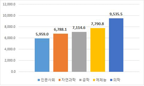 계열별로는 의학계열이 953만 5500원으로 학생 1인당 연간 평균등록금이 가장 높았다. 예체능계열이 779만 800원으로 뒤를 이었고 공학계열 711만 4600원, 자연과학계열 678만 8100원, 인문사회계열 595만 9000원이었다.